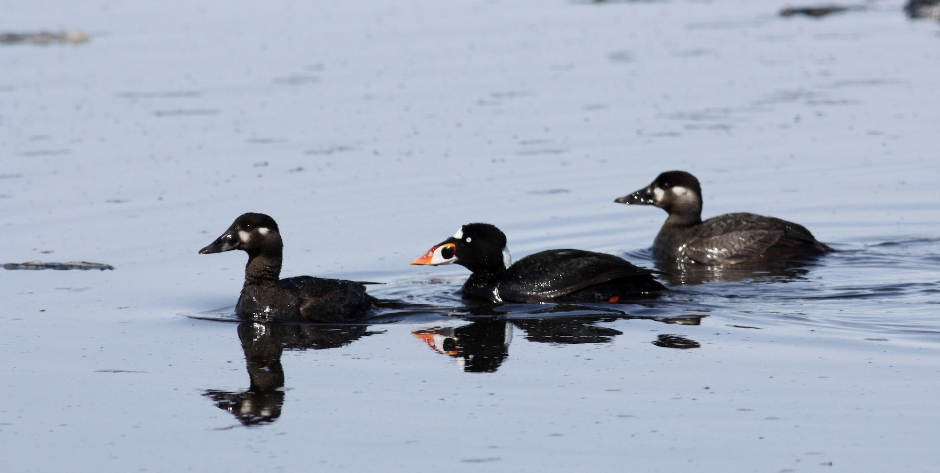 Large, dark sea duck. Breeding males have a colorful bill and white patches on the nape and forehead. Females and first-year males are dark brown with white patches on the cheek and face. Note large, thick-based bill to help separate from female White-winged Scoter. Breeds on lakes and ponds in northern Canada and Alaska; winters in flocks in harbors, bays, and other coastal waters, where dives for mussels and other aquatic invertebrates. Uncommon to rare inland, especially in migration. Frequently mixes with other sea duck species, especially eiders and scoters.